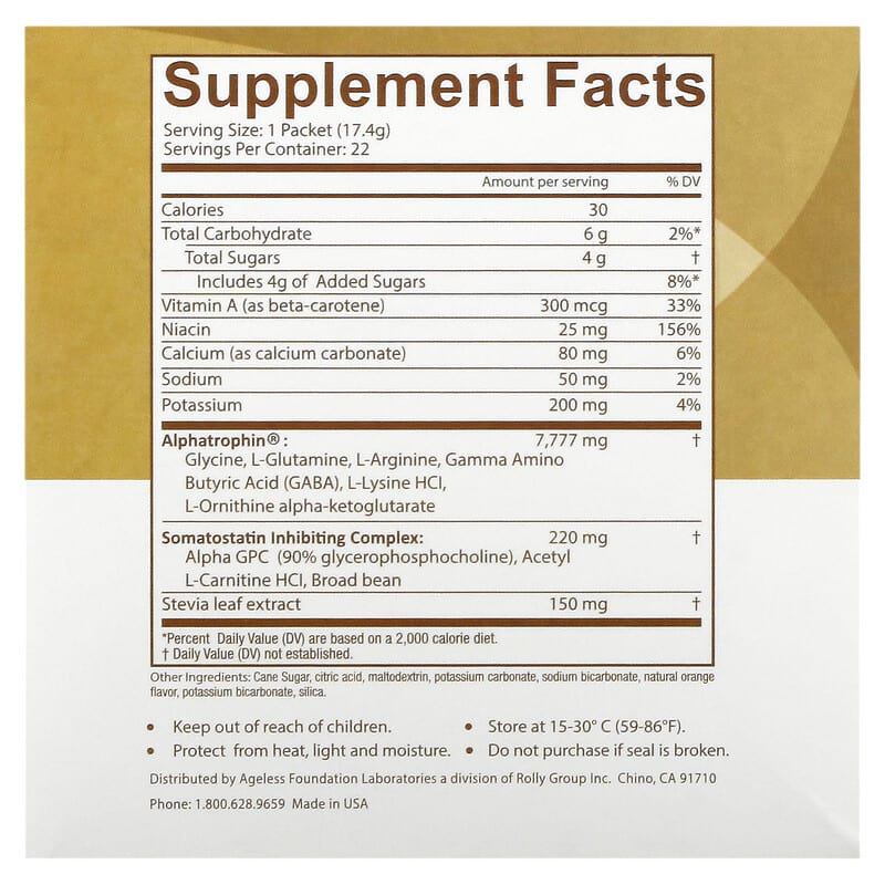 Thành phần có trong Ageless Foundation Laboratories UltraMax Gold Advanced Rejuvenation Formula with Alphatrophin Valencia Orange 22 Packets 0.61 oz (17.4 g) Each