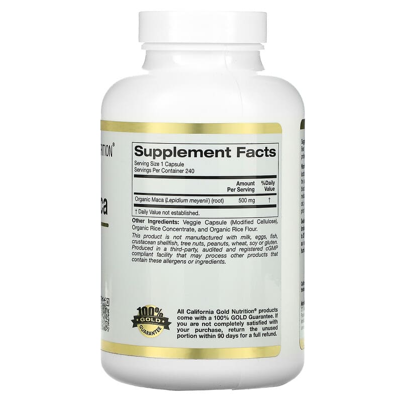 California Gold Nutrition Peruvian MacaFeaturing Organic Maca Root (Lepidium meyenii)Helps Support Sexual Health, Energy, and Well Being*Suitable for Vegetarians and VegansFormulated without Gluten, GMOs, or SoyProduced in a 3rd Party Audited cGMP Registered (Certified) Facility100% Gold Guarantee
