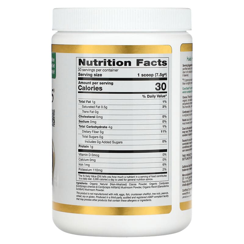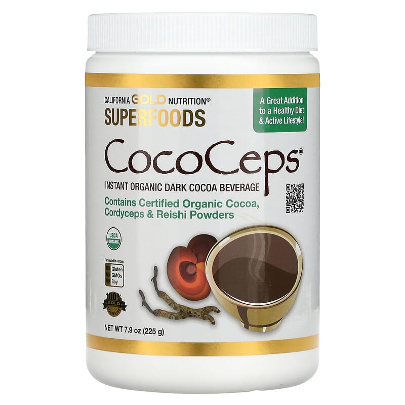 California Gold Nutrition Superfoods CocoCeps®Instant Organic Dark Cocoa BeverageContains Certified Organic Cocoa, Cordyceps & ReishiNaturally Energizing & Perfect for Drinking or BakingUSDA Organic, Certified by Oregon TilthNo Added Colors, Sugars or SweetenersFormulated to Contain: No Gluten, No GMOs, No SoyProduced in a 3rd Party Audited cGMP Registered (Certified) Facility100% Gold Guarantee