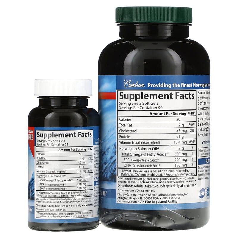 Igen Non-GMO Tested500 mg Omega-3sFreshness & Potency Purity GuaranteedDietary SupplementCardiovascular SupportBrain FunctionJoint HealthCarlson Providing the Finest Norwegian Omega-3s Since 1982Gluten-FreeNo Artificial PreservativesPurity GuaranteedIFOSAn FDA Regulated FacilitySalmon is some of the best fish we can get through our diet. However, most of us don’t eat enough salmon weekly to obtain the recommended amount of omega-3s, which is why a supplement can be a great option. Each serving of Norwegian Salmon Oil provides 500 mg of omega-3s, including EPA and DHA, which support heart, brain, vision, and joint health. Purity GuaranteedThis product is regularly tested by independent FDA registered laboratories. It has been determined to be fresh and fully potent (per AOCS international 25. protocols) and is free of detrimental levels of mercury, cadmium, lead, PCBs and 28 other contaminants.
