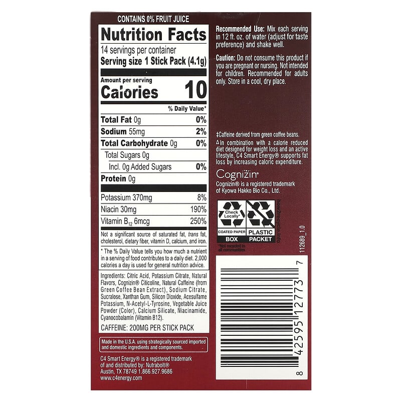 14 On-The-Go Individual Stick PacksNaturally Flavored With Other Natural FlavorsZero SugarNatural Energy‡Boosts MetabolismSupports Fat Loss^Sharpens Mental FocusEnergy Drink MixPromotes Well-BeingZero Artificial ColorsZero Artificial Flavors200 mg Natural CaffeineRefreshing Focus on-the-go powder drink mix with 200 mg of caffeine per individual stick packet. ‡Caffeine derived from green coffee beans. ^In combination with a calorie reduced diet designed for weight loss and an active lifestyle, C4 Smart Energy® supports fat loss by increasing caloric expenditure.