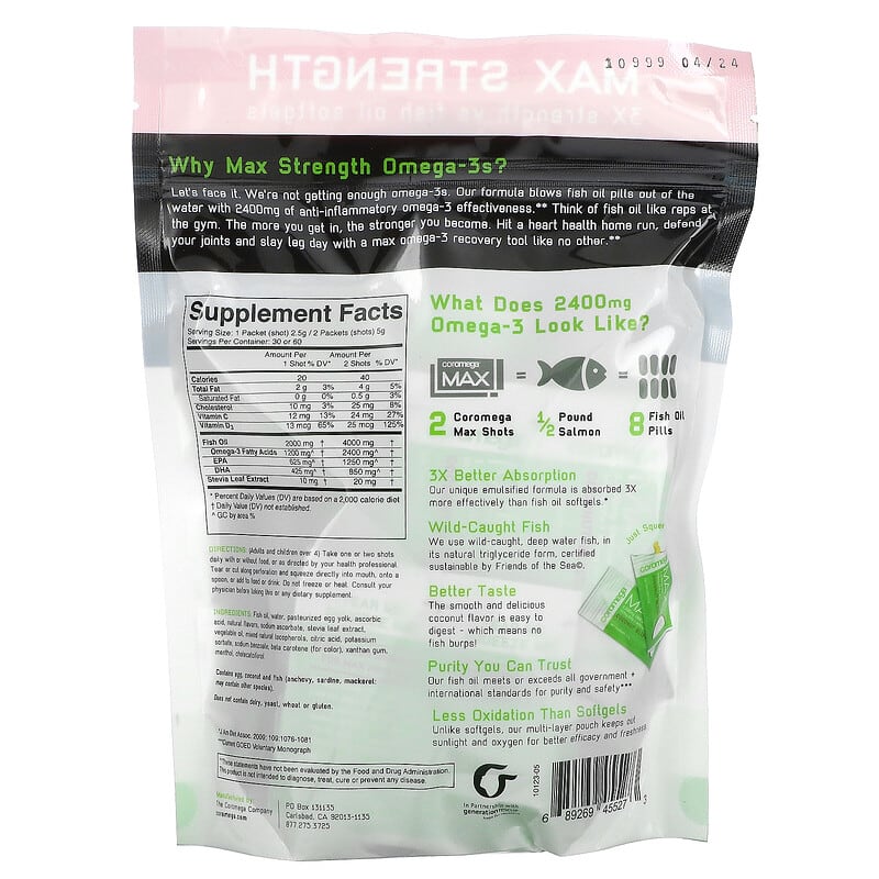 Max Strength3x Strength vs Fish Oil Softgels3X Better Absorption Than Softgels2400 mg Omega 3 Tastes Great + No Fish Burps1, 000 IU (25 mcg) Vitamin D3Wild-Caught Fish Dietary Supplement Why Max Strength Omega-3s?Let’s face it. We’re not getting enough omega-3s. Our formula blows fish oil pills out of the water with 2400 mg of anti-inflammatory omega-3 effectiveness. Think of fish oil like reps at the gym. The more you get in, the stronger you become. Hit a heart health home run, defend your joints and slay leg day with a max omega-3 recovery tool like no other. What Does 2400 mg Omega-3 Look like?2 Coromega Max Shots = 1/2 Pound Salmon = 8 Fish Oil Pills3X Better AbsorptionOur unique emulsified formula is absorbed 3X more effectively than fish oil softgels. *Wild-Caught FishWe use wild-caught, deep water fish, in its natural triglyceride form, certified sustainable by Friends of the Sea®. Better TasteThe smooth and delicious coconut flavor is easy to digest – which mean no fish burps!Purity You Can TrustOur fish oils meets or exceed all government + international standards for purity and safety***. Less Oxidation Than SoftgelsUnlike softgels, our multi-layer pouch keeps out sunlight and oxygen for better efficacy and freshness. *J Am Diet Assoc. 2009; 109: 1076-1081***Current GOED Voluntary Monograph