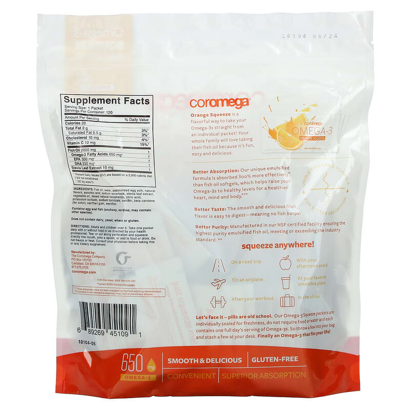 Omega-3 Squeeze Packets 650 mg Omega-3300% Better Absorption Than Softgels*Tastes DeliciousEasy to Use Single PacketOmega-3 SupplementUnique Emulsified Formula – For Better AbsorptionNSF- Content Tested & CertifiedSmooth & DeliciousGluten-FreeSuperior AbsorptionOrange Squeeze is a flavorful way to take your Omega-3 straight from an individual packet! Your whole family will love taking their fish oil because it’s fun, easy and delicious. Better Absorption: Our unique emulsified formula is absorbed 300% more effectively than fish oil softgels, which helps raise your Omega-3s to healthy levels for a healthier heart, mind and body. Better Taste: The smooth and delicious fruit flavor is easy to digest – meaning no fish burps!Better Purity: Manufactured in our NSF certified facility ensuring the highest purity emulsified fish oil, meeting or exceeding the industry standard**. Squeeze anywhereOn a roadtripOn an airplaneAfter your workout outWith your afternoon snackAt your favorite smoothie placeIn the officeLet’s face it – pills are old school. Our Omega-3 Squeeze packets are individuals sealed for freshness, do not require food or water and each contains one full day’s serving of Omega-3s. So throw a few into your bag and stash a few at your desk. Finally an Omega-3 that fits your life!*J Am Diet Assoc. 200; 109; 1076-1081**Current GOED Voluntary Monograph