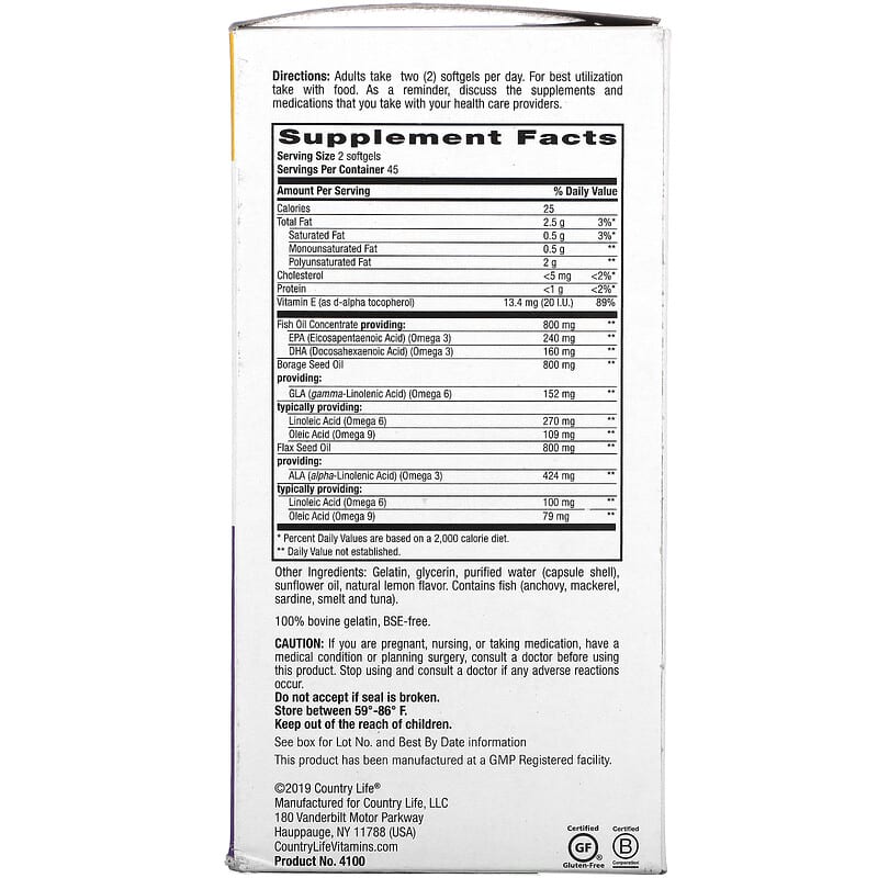 Established 1971Certified Gluten FreeOver 1,500 mg of Omegas Per Serving◊Third Party Tested – Processed Using Molecular DistillationCertified B CorporationDietary Supplement – Our Pledge of Integrity – AuthenticityCleanlinessFreshnessConsistencyAccuracy2 Softgels Provide:Fish Oil Concentrate 800 mgBorage Seed Oil 800 mgFlax Seed Oil 800 mgHelps Support:Cardiovascular HealthBrain HealthSkin Health and Immune System HealthNatural Lemon Flavored!Omega-3 fatty acids supplementation helps to meet daily essential fatty acid (EFA) requirements and has shown promise in many areas. Cardio HealthBrain HealthSkin HealthImmune HealthActive LifestyleALAThe body requires Alpha-linolenic acid (ALA) to make Omega-3 fatty acids, EPA and DHA. EPAPrecursor for hormone-like agents that regulates:Cell division & growthBlood clotting & Muscle activitySecretion of digestive juices and hormonesMovement of calcium in and out of cellsDHAMajor fatty aid found in the brainImportant for brain functionInvolved in signal transmission along neuronsOver 1,500 mg of Omega fatty acids from fish oil that has been processed using molecular distillation to ensure purity and from plant oils that are 100% expeller pressed without hexane or harsh chemicals. Omega 3 – EPA, DHA, and Alpha-linolenic AcidOmega 6 – Essential fatty acid Linoleic AcidOmega 9 – Monosaturated fatty acid Oleic Acid2 Softgels provide:Fish oil from 5 different sourcesBorage Seed OilFlax Seed OilAt Country Life, integrity is our #1 ingredient. Every product is rigorously tested to ensure it measures up against County Life’s 5 Integrity Standards: 1) authenticity of ingredients; 2) cleanliness of ingredients; 3) freshness of ingredients; 4) consistency of the formula; and 5) accuracy of labeling. YESCertified Gluten-Free by GFCO. org