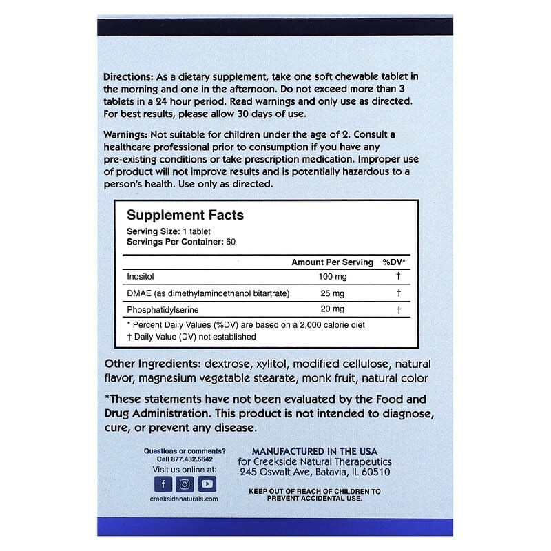 Pediatrician CreatedStimulant Free Attention Support For Children Ages 5 and UpSafe, EffectiveNon-Habit FormingGluten FreeNon-GMONutrition That Melts in Your MouthAttention, Focus and MemoryCreekside Naturals Focused Mind Jr. can help provide focus and memory support in the form of a delicious Orange Cream flavored EZ-Melt tablet. Created by a pediatrician, our formula is safe, effective, and made of natural, clinically proven ingredients. Focused Mind Jr. is a natural, non-habit forming supplement for children as young as 5 years of age. Dr. Natalie’s one-of-a-kind formula contains the following active ingredients: Inositol (100 mg), DMAE (25 mg), Phosphatidylserine (20 mg).