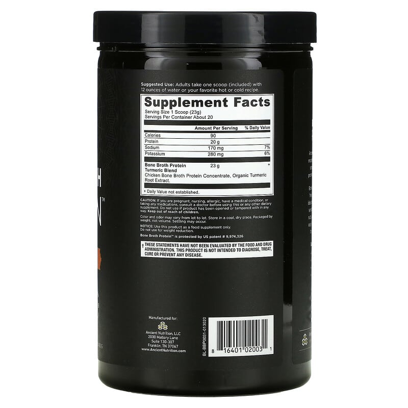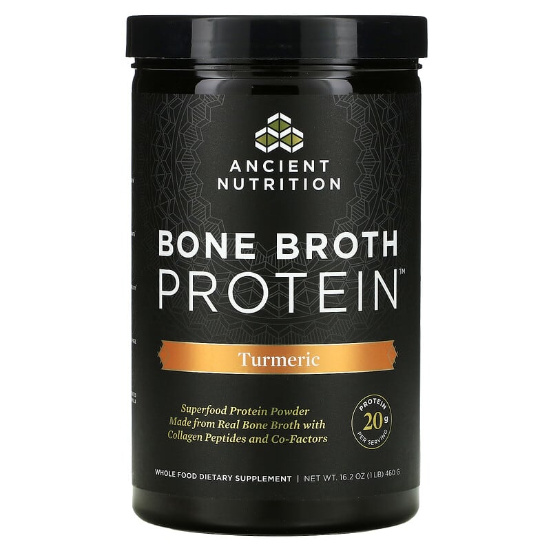 Protein 20 g Per ServingSuper Protein PowderMade from Real Bone Broth with Collagen Peptides and Co-FactorsWhole Food Dietary Supplement Dr. Axe FormulaAncient Nutrition for the Modern WorldSkinJointsMobilityGMO FreePatented FormulaAncient Nutrition provides what our modern world doesn’t; easy access to simple, whole food nutrients that promote health, strength, and vitality. Bone Broth Protein is paleo friendly, free of common allergens and the ideal protein source for those who are sensitive to dairy, grains, eggs, beef, nuts, and legumes. Bone broth made easy! Great in soups, stews or added to your favorite savory recipes. Each Serving Contains:11, 200 mg Collagen Type II1, 600 mg Chondroitin280 mg Hyaluronic Acid30 mg Glucosamine