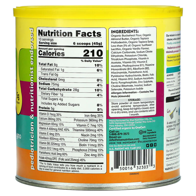 Organic buckwheat flour, organic almond butter, organic tapioca maltodextrin, organic tapioca syrup, less than 2% of: organic sunflower lecithin, organic vanilla flavour, calcium carbonate, sodium citrate dihydrate, potassium chloride, tricalcium phosphate, vitamin a acetate, vitamin d3, vitamin e acetate, phylloquinone (k1), thiamine mononitrate (b1), riboflavin (b2), niacinamide, pantothenic acid, pyridoxine hydrochloride, biotin, folic acid, vitamin b12, sodium ascorbate, ferric pyrophosphate, zinc sulphate, choline bitartrate, inositol, sodium selenate, potassium iodide. Allergen information – contains tree nuts (almonds).