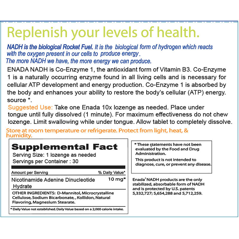 ENADA NADH is Co-Enzyme 1, the antioxidant form of Vitamin B3. Co-Enzyme 1 is a naturally occurring enzyme found in all living cells and is necessary for cellular ATP development and energy production. Co-Enzyme 1 is absorbed by the body and enhances your ability to restore the body’s cellular (ATP) energy source.