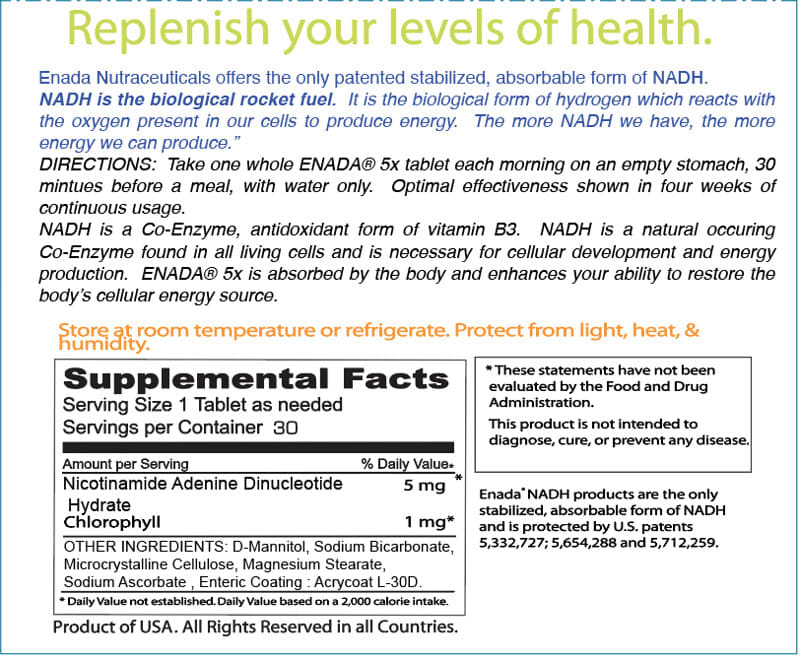 NADH is a Co-Enzyme, antioxidant form of vitamin B3. NADH is a natural occurring Co-Enzyme found in all living cells and is necessary for cellular development and energy production. ENADA® 5x is absorbed by the body and enhances your ability to restore the body’s cellular energy source.