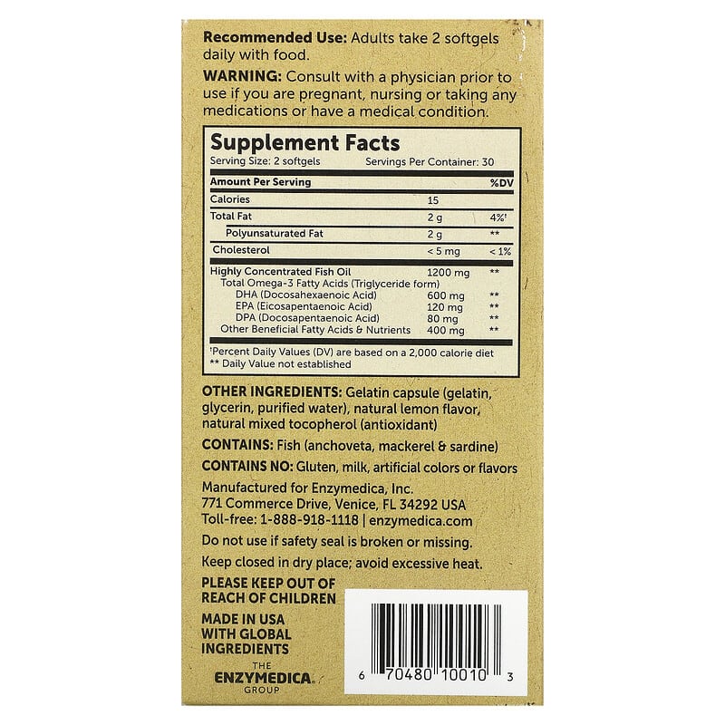 Sản phẩm Enzymedica Aqua Biome Omega-3 Classic Strength Lemon 600 mg 60 Softgels không phải là thuốc và không có tác dụng thay thế thuốc chữa bệnh. Người sử dụng nên tham khảo ý kiến của Bác sĩ hoặc Chuyên gia dinh dưỡng.
