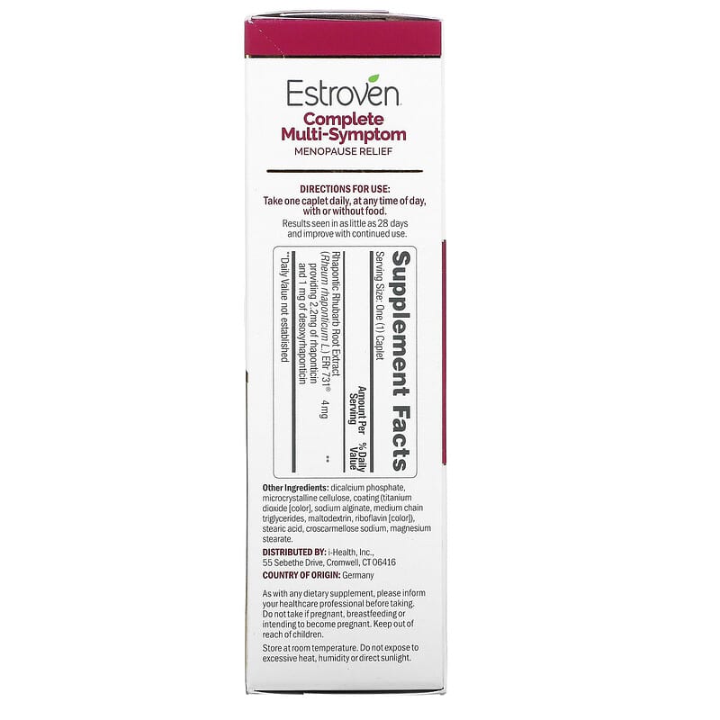 Estroven® Complete Multi-SymptomOther leading menopause brands Fast relief in as little as 28 days. May take up to 90 days to work. Plant based extract. Some formulas are based on synthesized chemicals including MSG and Ammonium Succinate. Demonstrated long term safety. Some have no published long term studies demonstrating safety. 1 small caplet per day. Up to 2 capsules per day. Contains clinically proven, plant-based Rhapontic Rhubarb Root Extract, which has been trusted by physicians for over 20 years to relieve menopause symptoms. § Compared to placebo per the Menopause Rating Scale (MRS).