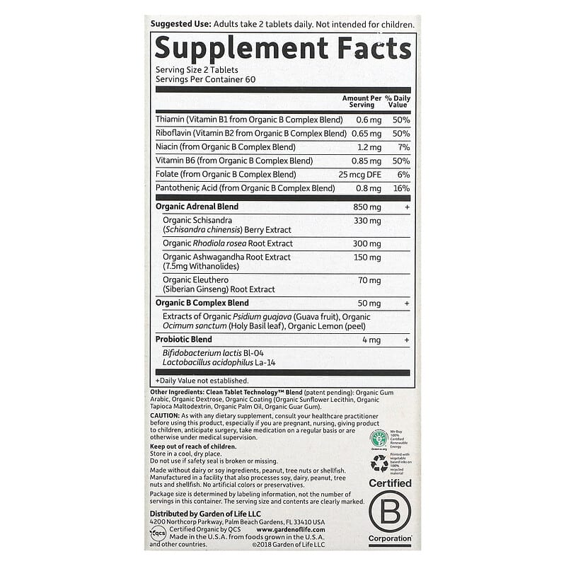 Thành phần có trong Garden of Life MyKind Organics Adrenal Daily Balance 120 Vegan Tablets