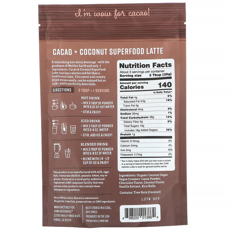 Hana Beverages Cacao & Coconut Latte Superfood Latte Mix / Non-Coffee Beverage Just Add Water / Makes 3 Cups Soy-Free, Dairy-Free & Vegan Non-GMO, No Gluten & No Trans Fats No Artificial Colors, Flavors, Sweeteners or PreservativesCacao & Coconut Latte / I’m Wow for Cacao!A nourishing non-dairy beverage with the goodness of Mother Earth and only 7 ingredients. Cacao & Coconut Superfood Latte has less calories and fat than a traditional latte. This sweet and creamy drink mixes easily, can be enjoyed hot or cold – and is perfectly delectable.