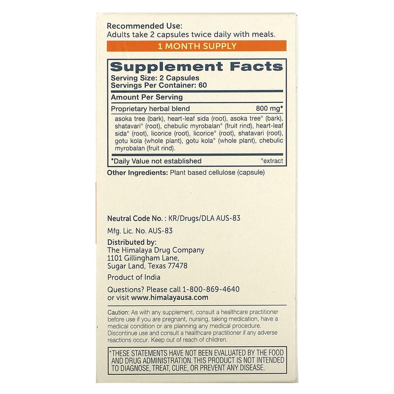 | Proprietary herbal blend asoka tree (bark), heart-leaf side (root), asoka tree° (bark), shatavari° (root), chebulic myrobalan° (fruit rind), heart-leaf sida° (root), licorice (root), licorice° (root), shatavari (root), gotu kola (whole plant), gotu kola° (whole plant), chebulic myrobalan (fruit rind). |