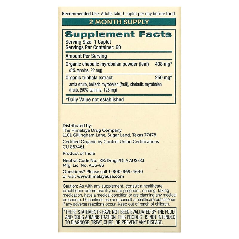 Since 1930Easy Colon Cleanse & DetoxTones Intestines for RegularityHerbal SupplementNon-GMO Project VerifiedUSDA Organic2 Month SupplyGluten FreeVegan FriendlycGMPCertified Organic by Control Union CertificationsFamily Owned for More Than 85 YearsTriphala translates humbly into the three fruits, but they are transformed when combined in a specific ratio and extracted with water, quickly becoming far more than the sum of their parts. The ancient recipe of Triphala has been handed down for thousands of years and remains among the strongest of digestive tonics. It has been shown to support detox, gentle colon cleansing and regularity with reliability and safety. Featured herbs on front: Amla (dried fruit), Belleric myrobalan (dried fruit) & Chebulic myrobalan (dried fruit). Happiness Through WellnessCrafting traditional medicines based on Ayurveda, a 5,000 year old science that believes the journey back to wholeness begins with nurturing the capacity for joy. Trusting the gifts of nature and the irreplaceable relationship between the plant and its native soil for consistent healing properties. Contributing to the wellness of the earth by teaching our family of farmers to grow native plants sustainably on their land and reduce the demand on the local environment. Building communities by advocating women in farming, protecting fair prices, providing maternal health, sponsoring clinical services and offering school wellness program. Believing that if wellness is the path to happiness, we must contribute to the wellness of all things. Wellness of people, wellness of the environment, wellness of our communities. Clinical Strength ExtractEach Himalaya Organic Triphala caplet is equivalent to 1,380 mg of Organic Triphala powder per serving.