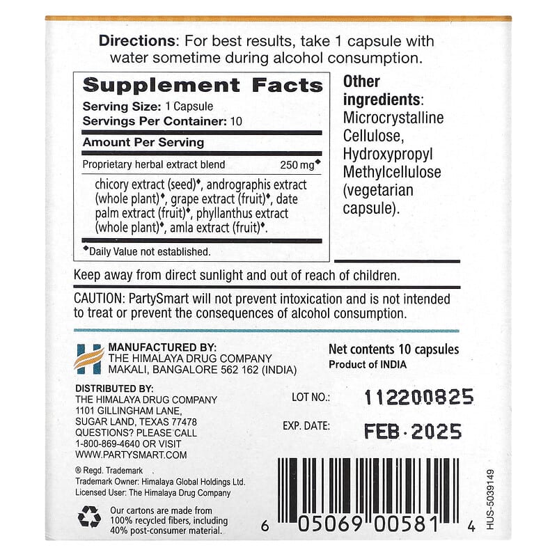 Thực phẩm bổ sung dưỡng chất (thuốc bổ) Himalaya PartySmart 10 Packets 1 Vegetarian Capsule Each chính hãng Himalaya, Mã vạch 605069005814, nhập khẩu từ Mỹ