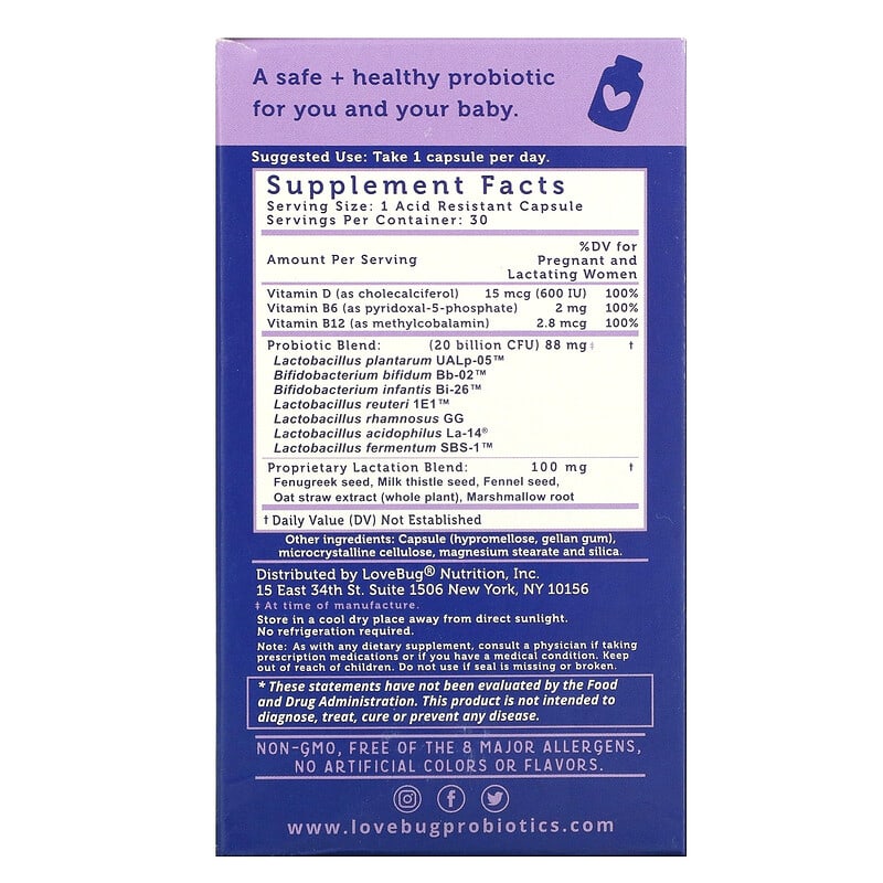Includes Crucial Strains For Breastfeeding Strong As A Mother™Postpartum + Immune SupportSupports Breast Milk Production20 Billion CFU Per Serving‡Once Daily Dietary Supplement Non-GMOFree of the 8 Major AllergensNo Artifical Colors or FlavorsA Safe + Healthy Probiotic For You and Your BabyAward-Winning Probiotics For The Whole Family™What Makes Our Probiotic Better?Guaranteed Potency‡Acid Resistant CapsulesNon-GMO and Free of the 8 Major AllergensA safe and effective probiotic to support lactation and breastfeeding. The Lovebug StoryAshley Harris, mom and Founder couldn’t find an effective and all natural probiotic to ease her son’s colic and digestive issues. Ashley had tested positive for Group B strep when she was pregnant and was given broad spectrum antibiotics as a preventative measure during labor. Those antibiotics killed off the Group B strep, but also the good bacteria that she was meant to pass on to ther baby to keep him healthy. Probiotics transformed her son’s and family’s health. Passionate about providing other families with that knowledge and a superior probiotic, she jumped into serious research and LoveBug Probiotics was born!‡At time of manufacture.
