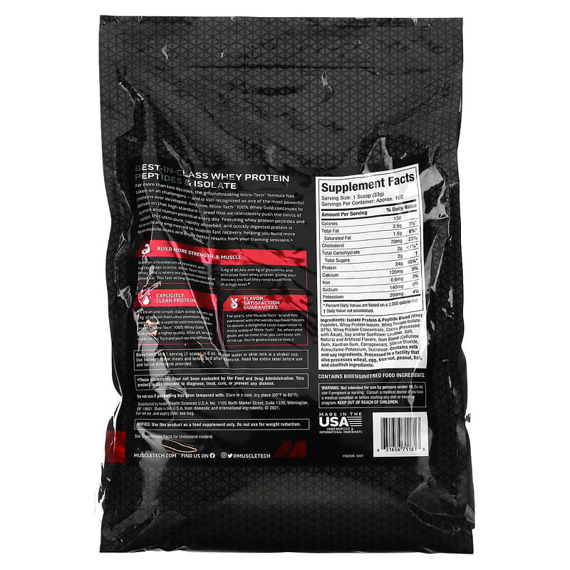 Support RecoveryEnhance Lean MuscleGluten FreePeptides & Isolate Primary Source24 g Protein‡5. 4 g BCAAs‡, **4 g Glutamine & Precursor‡, **Natural & Artificial Flavors Dietary Supplement Best-In-Class Whey Protein Peptides & IsolateFor more than two decades, the groundbreaking Nitro-Tech® formula has taken on all challengers – and is still recognized as one of the most powerful proteins ever developed. And now, Nitro-Tech® 100% Whey Gold continues to deliver on that high standard – proof that we relentlessly push the limits of science and human potential every day. Featuring whey protein peptides and isolate, this ultra-pure, rapidly absorbed, and quickly digested protein is scientifically engineered to support fast recovery, helping you build more lean muscle mass and enjoy better results from your training sessions. Build More Strength & MuscleBuilt on a foundation of research and cutting-edge science, Nitro-Tech® 100% Whey Gold is where our passion meets your potential. This fast-acting formula delivers 5. 4g of BCAAs and 4g of glutamine and precursor from whey protein, giving your muscles the fuel they need to perform at a high level. Explicitly Clean ProteinIt’s clean and simple. Each scoop serves up 24g of ultra-premium whey protein. Using a superior cold microfiltration process, Nitro-Tech® 100% Whey Gold guarantees a higher quality. After all, what’s inside counts. Try it and you’ll see the difference. Flavor Satisfaction GuaranteedFor years, the MuscleTech® brand has partnered with the world’s top flavor houses to deliver a delightful taste experience in every scoop of Nitro-Tech® 100% Whey Gold. So, when your goals are so close that you can taste ’em, drink up. You’re guaranteed to love it. See Supplement Facts for cholesterol content. **From whey protein‡Per serving