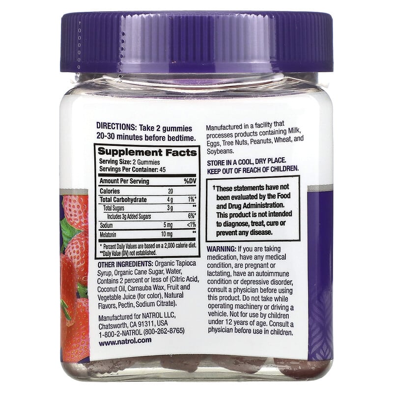SleepFall Asleep FasterStay Asleep Longer100% Drug-Free Dietary Supplement Sleep Better Tonight Rest Assured#1 Melatonin Brand^Non-GMOVegetarian & Gelatin FreeNo Artificial Flavors, Sweeteners or PreservativesYour Sweetest Sleep YetNatrol® Melatonin gummies help you get better sleep so you wake up rested. And they taste great too!Melatonin is naturally produced in the body to help guide your ‘sleep-wake’ cycle. Factors like stress, diet, age and screen time before bed can interrupt melatonin production and disrupt your sleep. Natrol Melatonin can help. ^Nielson xAOC, 52 weeks ending 05/22/21