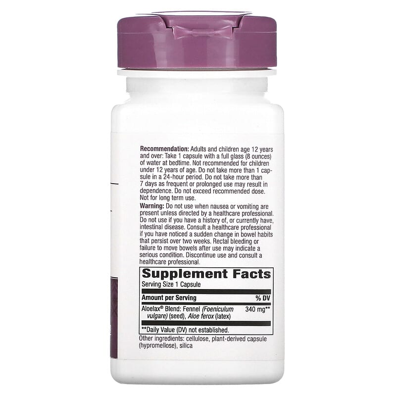 Do not use when nausea or vomiting are present unless directed by a healthcare professional. Do not use if you have a history of, or currently have, intestinal disease. Consult a healthcare professional if you have noticed by a sudden change in bowel habits that persist over two weeks. Rectal bleeding or failure to move bowels after use may indicate a serious condition. Discontinue use and consult a healthcare professional.Notice: This product contains aloe. Read and follow directions carefully. Do not use if you have or develop diarrhea, loose stools or abdominal pain, because Aloe may worsen these conditions and be harmful to your health. Consult your physician if you have frequent diarrhea, or if you are pregnant, nursing, taking medications or have a medical condition.Keep out of reach of children. Safety sealed with printed inner seal. Do not use if seal is broken or missing. Keep tightly closed. Store at room temperature. Avoid excessive heat and direct sunlight.