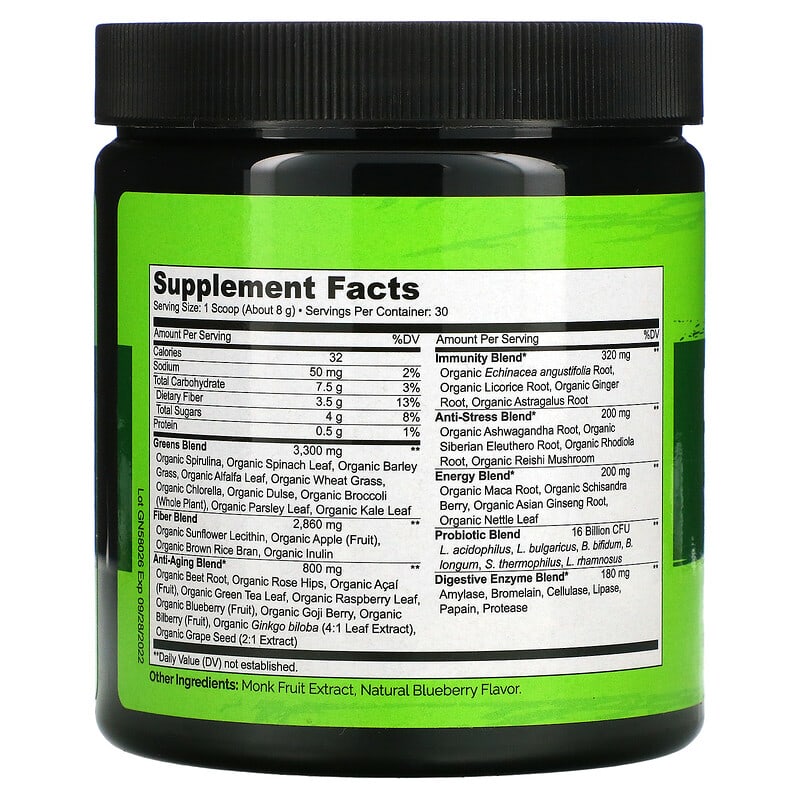 | Greens Blend Organic Spirulina, Organic Spinach Leaf, Organic Barley Grass, Organic Alfalfa Leaf, Organic Wheat Grass, Organic Chlorella, Organic Dulse, Organic Broccoli (Whole Plant), Organic Parsley Leaf, Organic Kale Leaf |