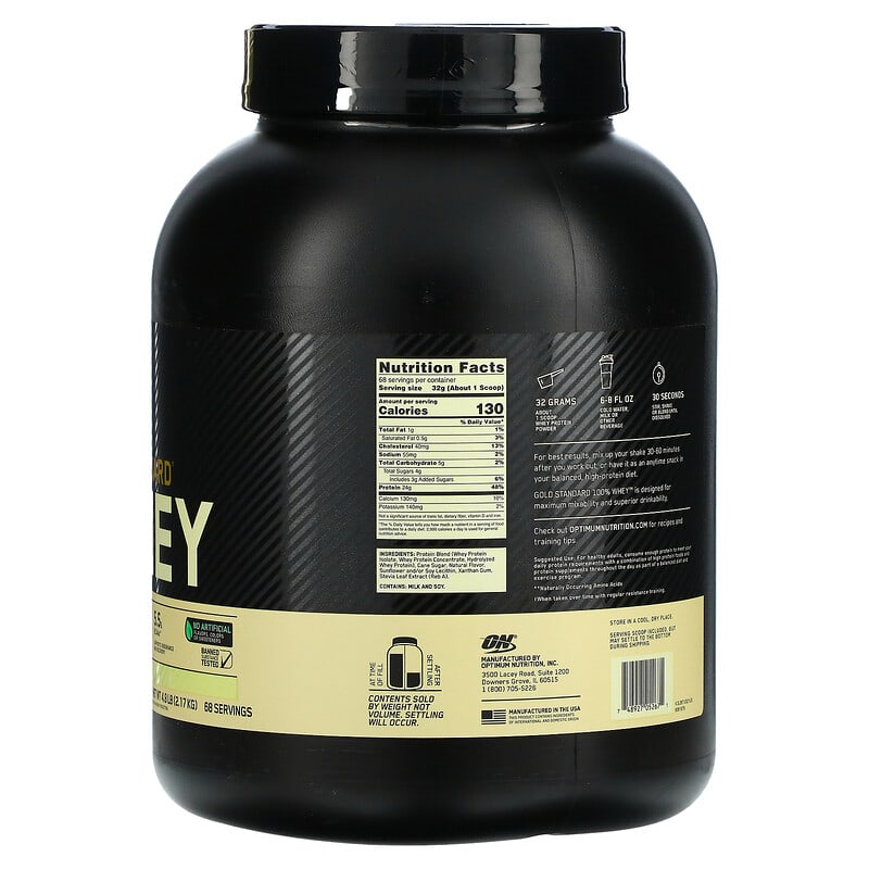 For Muscle Support & Recovery24 g Protein – Helps Build and Maintain Muscle 5. 5 g BCAAs – Supports Endurance and Recovery No Artificial Flavors, Colors or Sweeteners Banned Substance Tested Naturally Flavored with Other Natural Flavors100% of The Protein From Whey Protein Powder Drink MixStrength TrainingSports PerformanceActive LifestyleNo Artificial Growth Hormones^Authentic Optimum Nutrition ProductGluten FreeInformed Choice – We Test You Trust – Regularly Tested for Banned Substances Why Gold Standard 100% Whey?Packed with 24 grams of high-quality protein per serving to help build muscleWhey Protein Isolate (WPI) is the primary ingredient with further carbs and fat “isolated’ out. 11 grams of naturally occurring Essential Amino Acids (EAAs) to support muscle recovery. The GOLD STANDARD® for protein quality, fueling over 2 billion workout recoveries worldwide since 1998. OPTIMUM NUTRITION® has been trusted to provide the highest quality in post-workout recovery, pre-workout energy, and are on-the-go sports nutrition for over 30 years and in 90+ countries. After careful supplier selection, each ingredient is tested to assure exceptional purity, potency and composition. We hold ourselves to the highest production standards,. all so you can unlock your body’s full potential. GOLD STANDARD 100% WHEY™ is designed for maximum mixability and superior drinkability. ^No significant difference has been shown between milk derived from rbst-treated and non-first treated cows. **Naturally occurring Amino Acids‡When taken over time with regular resistance training.