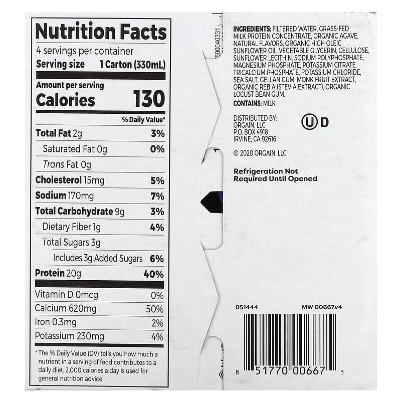 Grass-Fed Protein20 g Grass-Fed ProteinGluten FreeNo Soy IngredientsNo Artificial PreservativesNon-GMOKosher DairyCleaner Ingredients100% New Zealand Sourced Pasture-Raised Milk ProteinOrganic AgaveMonk fruit ExtractHigher StandardsNo Soy IngredientsGluten FreeNon-GMOCarrageenan FreeNo Artificial SweetenersNo Artificial FlavorsNo Artificial PreservativesOur commitment to: Clean NutritionOrgain’s relentless pursuit of better nutrition that doesn’t compromised on taste is based on my belief that real foods can make a real difference. That passion fuels our mission to help people live vibrant lives through good, clean nutrition. In Good Health, -Andrew Abraham, M. D., Founder, Doctor and Cancer SurvivorProtein That’s Yum-Believable. Goodbye chalky, gritty protein. Hello, creamy smoothness in every sip. Our Clean Protein shakes are Non-GMO, have no carrageenan or artificial preservatives or flavors. These babies are packed with protein and swoon-worthy flavor to serve up goodness that keeps you fueled, no matter where you are. Simply put: 20 g grass-fed milk protein, no artificial flavors, colors or preservatives, and much yum. ^Not a reduced calorie food. *Per Serving.