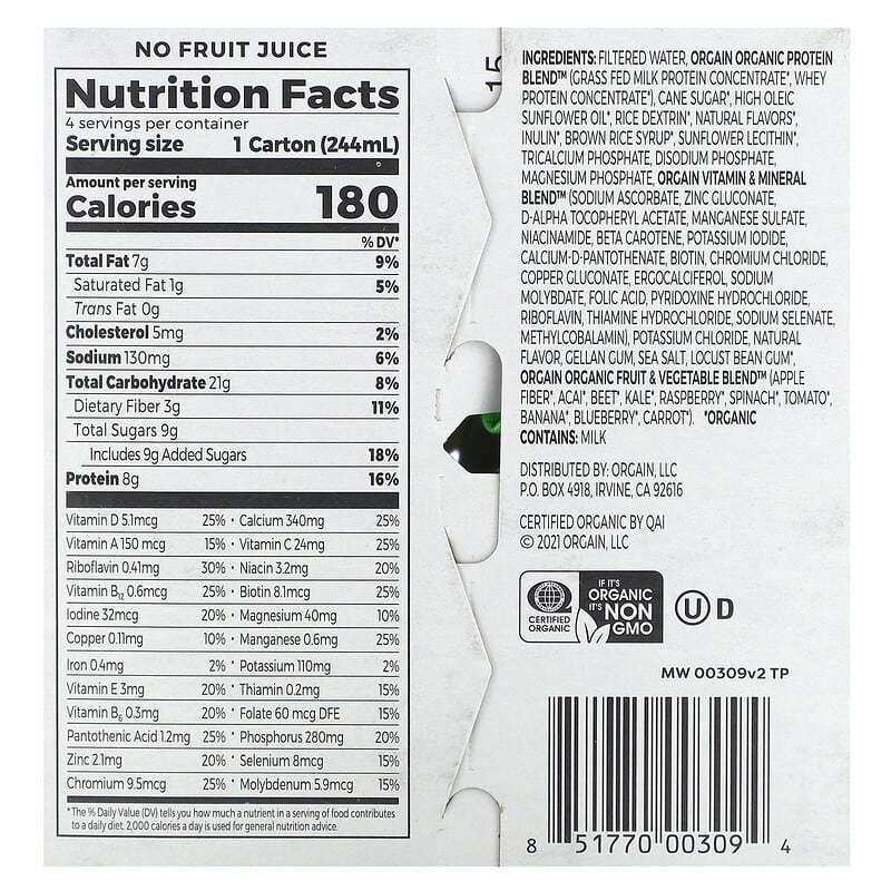 copper gluconate, ergocalciferol, sodium molybdate, folic acid, pyridoxine hydrochloride, riboflavin, thiamine hydrochloride, sodium selenate methylcobalamin), potassium chloride, natural flavor, gellan cum, sea salt, locust bean gum*, orgain organic fruit & vegetable blend™ (apple fiber*, acai*, beet*, kale*, raspberry*, spinach*, tomato*, banana*, blueberry*, carrot*). *OrganicContains: milk