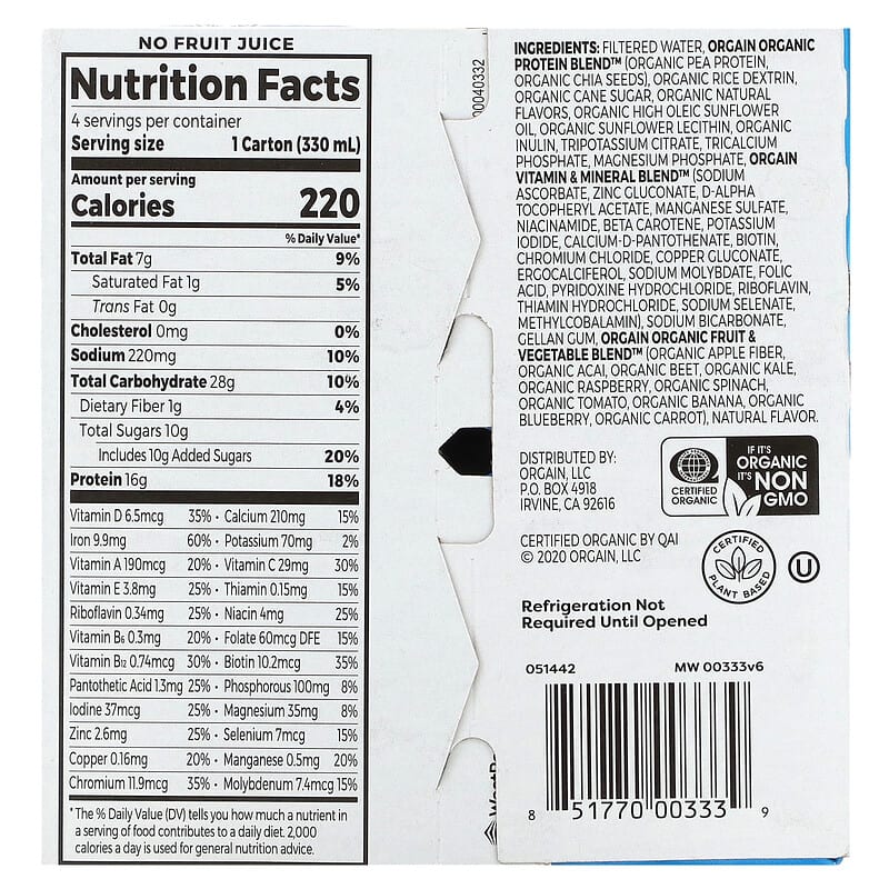 Filtered water, orgain organic protein blend™ (organic pea protein, organic chia seeds), organic rice dextrin, organic cane sugar, organic natural flavors, organic high oleic sunflower oil, organic sunflower lecithin, organic inulin, tripotassium citrate, tricalcium phosphate, magnesium phosphate, orgain vitamin & mineral blend™ (sodium ascorbate, zinc gluconate, d – alpha tocopheryl acetate, manganese sulfate, niacinamide, beta carotene, potassium iodide, calcium – d – pantothenate, biotin, chromium chloride, copper gluconate, ergocalciferol, sodium molybdate, folic acid, pyridoxine hydrochloride, riboflavin, thiamin hydrochloride, sodium selenate, methylcobalamin), sodium bicarbonate, gellan gum, orgain organic fruit & vegetable blend™ (organic apple fiber, organic acai, organic beet, organic kale, organic raspberry, organic spinach, organic tomato, organic banana, organic blueberry, organic carrot), natural flavor.