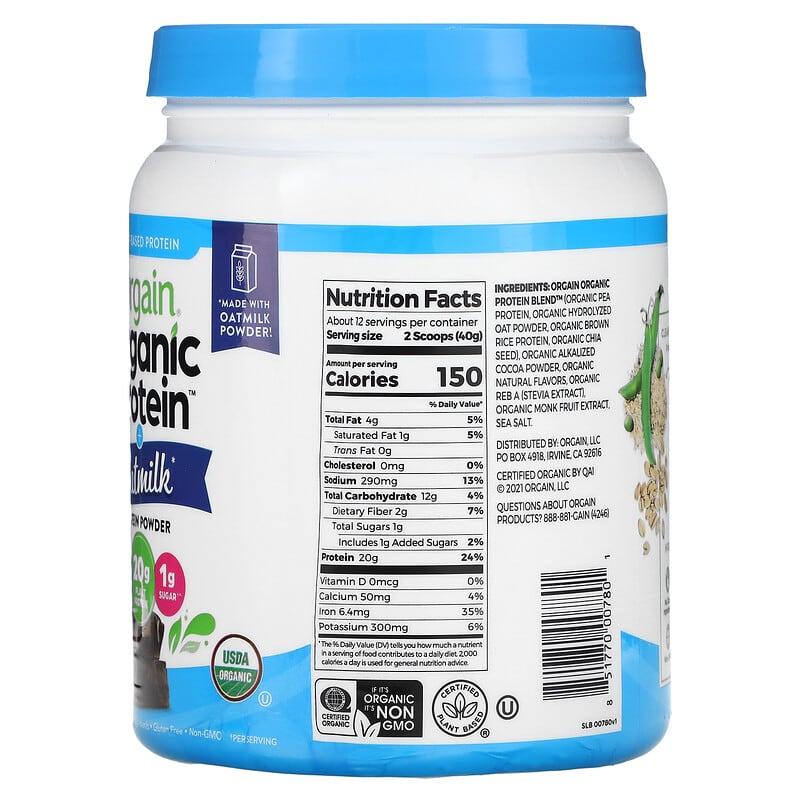 Plant-Based Protein*Made With Oatmilk PowderOrganic Oats 20 g Plant Protein†1 g Sugar†^USDA Organic KosherVeganNo Soy or Dairy Ingredients Gluten Free Non-GMO Good, Clean Nutrition™Certified Organic by QAICertified Plant BasedCleaner Ingredients: Powder made fromOrganic Pea Protein Organic OatsOrganic Brown RiceOrganic Chia SeedsHigher Standards No dairy ingredients No soy ingredients Gluten freeNon-GMO Vegan2 g Sugar†^Our Commitment To Clean NutritionOrgain’s relentless pursuit of better nutrition that doesn’t compromise on taste is based on my belief that real foods can make a real difference. That passion fuels our mission to help people live vibrant lives through good, clean nutrition. In Good Health, -Andrew Abraham, M. D., Founder, Cancer Survivor & Food EntrepreneurOur OG Plant-Based Protein Doesn’t Give a Grit. Our best-selling plant-based protein powder is as clean as it gets. Crafted with Certified USDA Organic ingredients hand-selected for maximum nutrition, it’s made without soy, gluten, or artificial flavors, and not even one drop of dairy.