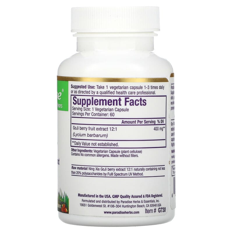 Thực phẩm bổ sung dưỡng chất (thuốc bổ) Paradise Herbs Goji 60 Vegetarian Capsules chính hãng Paradise Herbs, Mã vạch 601944777302, nhập khẩu từ Mỹ