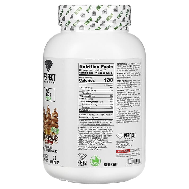 Thực phẩm bổ sung dưỡng chất (thuốc bổ) Perfect Sports Vegan Diesel 100% Plant-Based Protein Blend Chocolate Ice Cream 1.5 lb (700 g) chính hãng Perfect Sports, Mã vạch 699097754882, nhập khẩu từ Mỹ