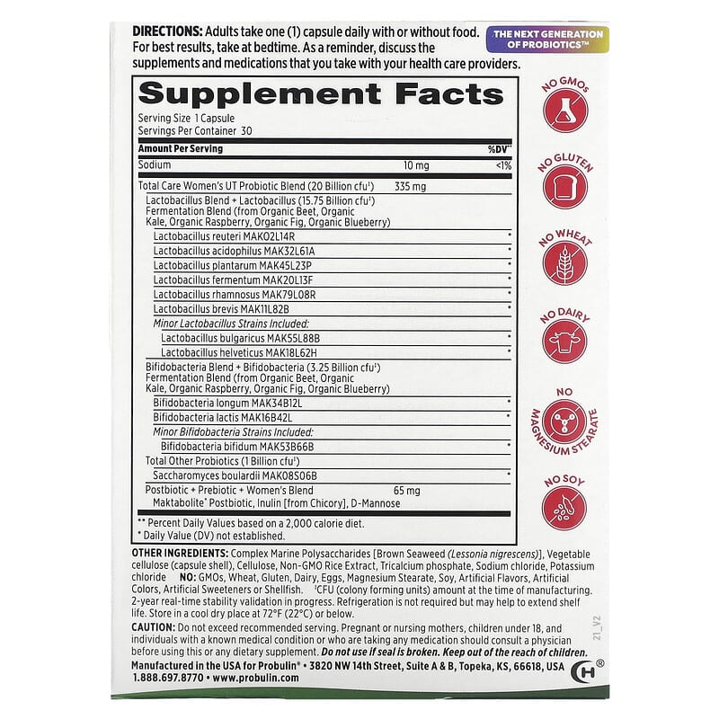 Thực phẩm bổ sung dưỡng chất (thuốc bổ) Probulin Total Care Women’s UT Probiotic 20 Billion CFU 30 Capsules chính hãng Probulin, Mã vạch 855757003534, nhập khẩu từ Mỹ