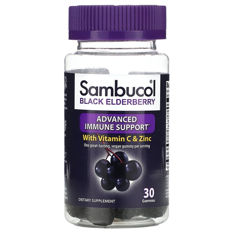 Thực phẩm bổ sung dưỡng chất (thuốc bổ) Sambucol Black Elderberry Advanced Immune Support with Vitamin C & Zinc 30 Gummies chính hãng Sambucol, Mã vạch 896116001228, nhập khẩu từ Mỹ