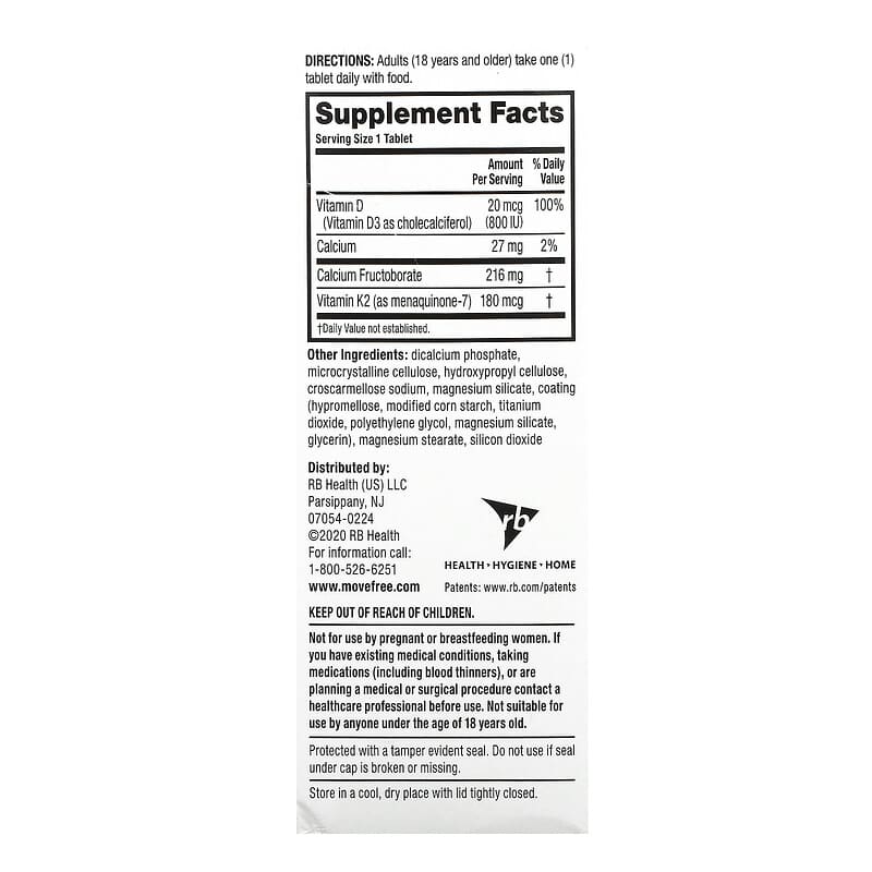 Since 1936Calcium Fructoborate + Vitamins K2 + DClinically Proven Faster Joint Comfort‡, 1, 2Bone Strength Support Helps Support Calcium Absorption 1 Tiny Pill a Day Dietary Supplement Health – Hygiene – HomeMove Free®. For what moves you. We believe in delivering clinically proven benefits to keep people connected to what they love most: Move Free® Ultra Bone Strength Support uses a unique formulation with Calcium Fructoborate+ Vitamins K2 + D. 7 Days – Clinically proven to deliver better joint comfort in as little as 7 days. ‡†Helps bind calcium to bones to support healthy bones. Supports calcium absorption to help maintain strong bones. About our ingredients: What is Calcium Fructoborate: Calcium Fructoborate is a unique and clinically proven mineral complex originally discovered in plants that supports joint health. Calcium Fructoborate is also thought to help support healthy vitamin D levels, which are needed tp help the body absorb calcium. What is Vitamin K2: This is one of the most clinically studied forms of Vitamin K. Vitamin K2, as MK-7, has higher bioavailability and plays an instrument role in supporting strong bone mass and structure. What is Vitamin D: Getting enough Vitamin D from food alone can be difficult. Vitamin D supports calcium absorption and is essential for the maintenance of healthy bone mineralization. Tiny & Easy-To-Take Pill: Taking big pills every day can be a challenge. With Move Free® Ultra Bone Strength Support, you just need to take 1 tiny pill a day instead of 2 large Glucosamine + Chondroitin tablets. ‡Calcium Fructoborate is clinically proven to deliver joint comfort in as little as 7 days. †1. Based on data from 14-day clinical research publications comparing Calcium Fructoborate to placebo with continued use (Pietrzkowski, Z., et al., Clin Interv Aging, 2014); and Glucosamine & Chondroitin to placebo (Reyes-Izquierdo, T., et al., j Aging Res Clin Pract, 2014). 2. Based on a 90-day randomized placebo controlled clinical study measuring the effect of 216 mg of Calcium Fructoborate (Pietrzkowski, Z., et al., J Aging Res Clin Pract, 2018).
