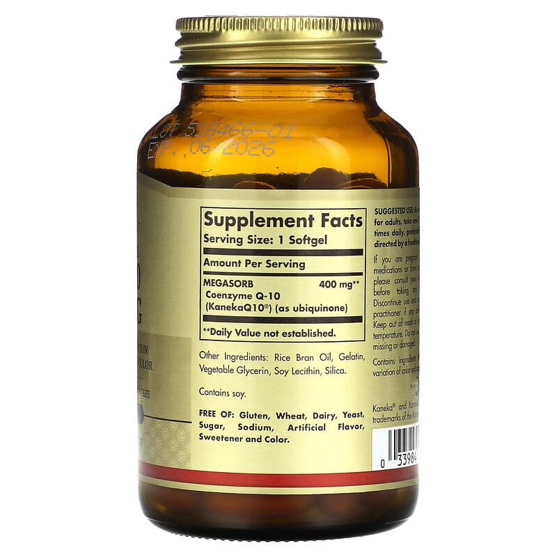 Solgar Megasorb CoQ-10 400 mg 60 Softgels là thực phẩm bổ sung dinh dưỡng của hãng Solgar, sản phẩm có mã vạch: 033984009752; kích thước hộp: 6.1 x 6.1 x 10.7 cm, trọng lượng (cả bao bì) 0.27 kg, được nhập khẩu từ USA – Mỹ