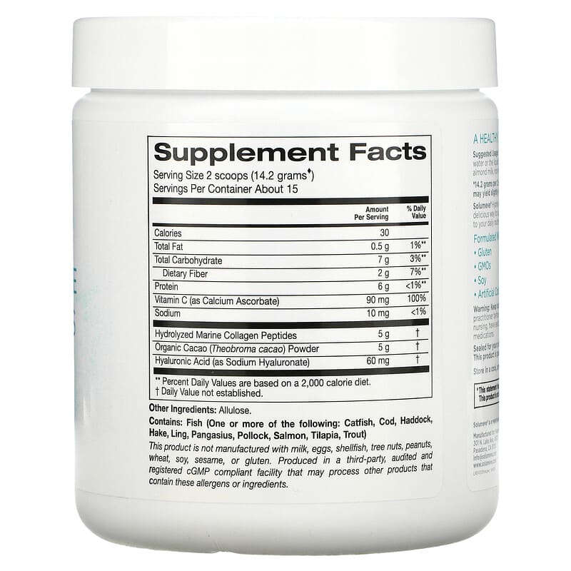 Sôlumeve® Hydrolyzed Marine Collagen Peptides with CocoaSupports Healthy Hair, Skin, and Nails*Made with Organic Cocoa for a Delicious Chocolate FlavorFormulated without Gluten, GMOs, or SoyNo Artificial Colors or Flavors Dietary Supplement Produced in a cGMP Facility