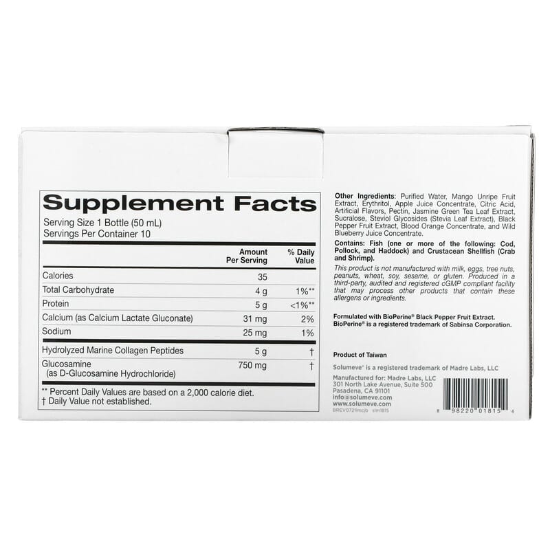 Sôlumeve Liquid Marine Collagen Peptides10 Single-Serving BottlesMango Apple FlavorHydrolyzed Marine Collagen Peptides with GlucosamineSupports Joints, Bone, Hair, Skin, and Nails*Non-Bovine and Non-PorcineFormulated without Gluten, GMOs, or Soy Dietary Supplement Produced in a cGMP Facility