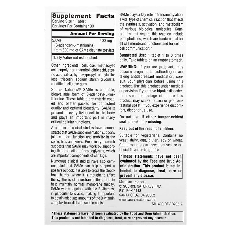 Improved Enteric Coating Dietary Supplement S-Adenosyl-L-MethionineSupports Joint Comfort, Function and Mobility Suitable for VegetariansSource Naturals® SAMe is a stable, bioavailable form of S-adenosyl-L-methionine. These tablets are enteric coated and blister packed for consistent quality and optimal bioactivity. SAMe is present in every living cell in the body and plays an important part in many critical cellular functions. A number of clinical studies have demonstrated that SAMe supplementation supports joint comfort, function and mobility in the spine, hips and knees. Preliminary research suggests that SAMe may work by supporting the production of proteoglycans, which are important components of cartilage. Numerous clinical studies have also demonstrated that SAMe can help support a positive outlook. It is able to cross the bloodbrain barrier, where it is thought to affect the synthesis of neurotransmitters, and to help maintain normal membrane fluidity. SAMe works together with the B-vitamins, in particular folic acid, making it important to obtain adequate amounts of the B-vitamin complex from diet and supplements. SAMe plays a key role in transmethylation, a vital type of chemical reaction that affects the synthesis activation, and metabolism of various biological molecules. Compounds that require this reaction include phospholipids, which are fundamental for all cell membrane functions and for cell to cell communication.