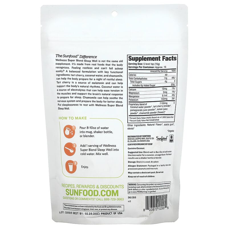 Super FoodsUSDA OrganicNon-GMO Project VerifiedVeganGluten-FreeKosherNo Added Sugar A Daily Soothing Blend Made With Real Foods For Better Sleep Dietary Supplement Certified Organic by CCOFThe Sunfood™ DifferenceWellness Super Blend Sleep Well is not the same old supplement. It’s made from real foods that the body recognizes. Feeling restless and can’t fall asleep easily? A balanced formulation with key functional ingredients: tart cherry, coconut water, and chamomile, can help the body prepare for a night of restful sleep. Tart cherry is a source of melatonin and can help support the body’s natural rhythms. Coconut water is a source of electrolytes that can help ease tension in the muscles and support the brain’s natural response to prepare for sleep. Chamomile can help soothe the nervous system and prepare the body for better sleep. Put sleeplessness to rest with Wellness Super Blend Sleep Well.