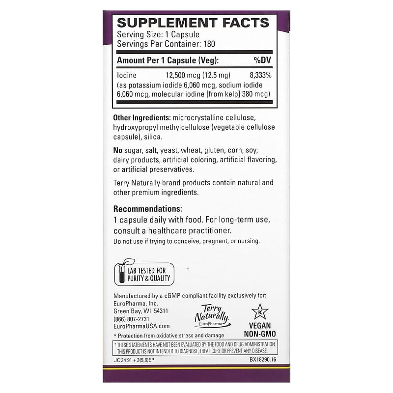 Thực phẩm bổ sung dưỡng chất (thuốc bổ) Terry Naturally Tri-Iodine 12.5 mg 180 Capsules chính hãng Terry Naturally, Mã vạch 367703182908, nhập khẩu từ Mỹ