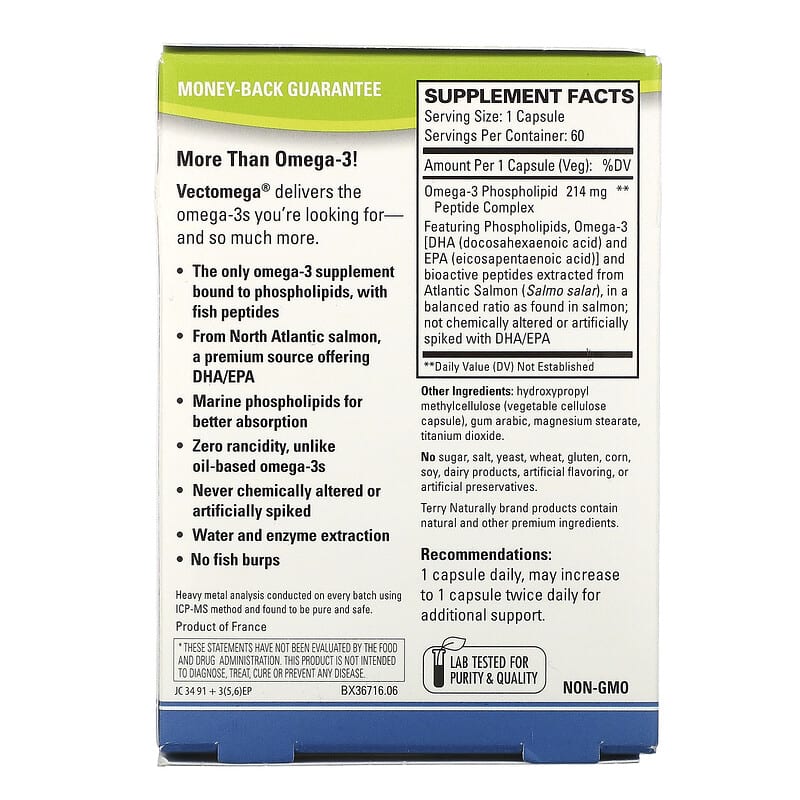 Powerful Nutrients for Your Healthy Heart, Brain, and EyesFrom North Atlantic SalmonJust 1 Daily Dietary Supplement Go Beyond Krill & Fish OilNon-GMO Lab Tested for Purity & Quality Real Omega-3s Produce Real ResultsManufactured by a cGMP Compliant Facility Choose Vectomega® because it offers more than fish or krill oil. Vectomega has Omega-3 PLUS Phospholipids & Peptides for Healthier Results!