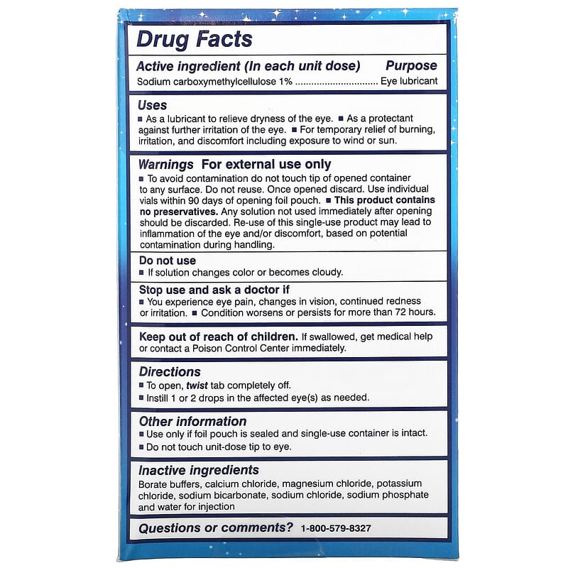 For external use only. To avoid contamination do not touch tip of opened container to any surface. Do not reuse. Once opened discard. Use individual vials within 90 days of opening foil pouch. This product contains no preservatives. Any solution not used immediately after opening should be discarded. Re-use of this single-use product may lead to inflammation of the eye and/or discomfort, based on potential contamination during handling. Do not useIf solution changes color or becomes cloudy. Stop use and ask a doctor if:You experience eye pain, changes in vision, continued redness or irritation. Condition worsens or persists for more than 72 hours. Keep out of reach of children. If swallowed, get medical help or contact a Poison Control Center immediately. Use only if foil pouch is sealed and single-use container is intact. Do not touch unit-dose tip to eye.