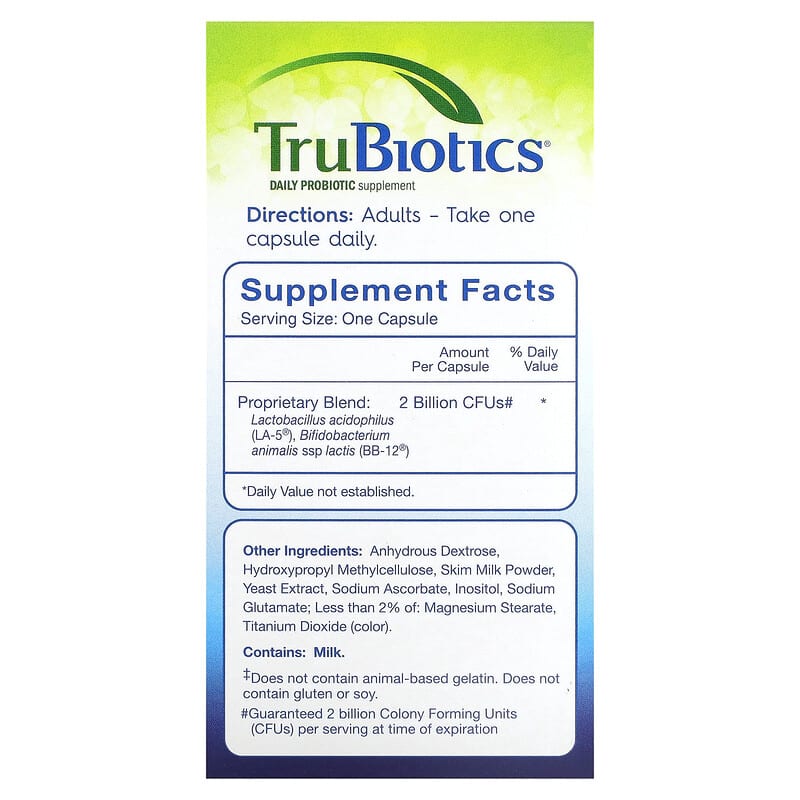 Unique Formula With the 2 Most Studied Types of Good BacteriaDaily Probiotic SupplementEasy-to-Swallow CapsulesVegetarian‡ CapsulesDo More for Your Microbiome and Overall HealthTruBiotics Supports Your Digestive and Immune HealthNaturally Helps to:Keep Your Digestive System Running SmoothlyMaintain Peak ImmunityWhy Should I Take TruBiotics?Taking probiotics every day helps maintain the natural balance of good bacteria in your digestive tract that is impacted by lifestyle factors including diet, stress and travel. Works 2 WaysDigestive HealthImmune HealthHelps both your digestive and immune systems work their best. Contains a proprietary blend of the 2 most clinically studied types of good bacteria. Supports the 70% of your immune system found in the digestive tract. The TruBiotics Promise:Made with the highest products and quality standards. Guaranteed potency through the expiration date when stored as directed. ‡Does not contain animal-based gelatin. Does not contain gluten or soy.