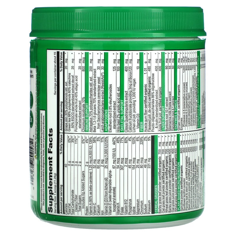 Plant-Based SuperfoodMost Award Winning!+25 Billion Probiotics1Clinically FormulatedSoy FreeDairy FreeNon-GMOGluten FreeVegan Friendly 15 Day Supply Drink Powder Dietary Supplement Look What’s Inside – No Proprietary Blends | Full Disclosure LabelingTripled Tested For PuritySupports The 4 Foundations of HealthNutritionDigestionCirculationImmunity1Per serving at time of manufacturing.