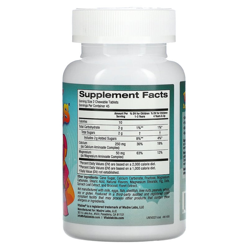 Vitables Chewable Calcium Plus Magnesium for Children Super Chewables for Superheroes!Supports the Growth of Healthy Bones and Muscles*Essential Mineral BlendFruit and Vegetable ConcentratesBirthday Cake Flavor90 Vegetarian Chewable Tablets Gluten FreeNo Artificial Colors or PreservativescGMP Manufactured and Quality Confirmed