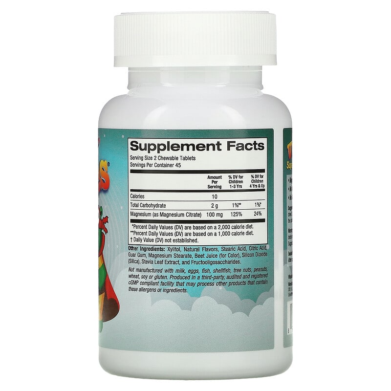 Vitables Chewable Magnesium for ChildrenSuper Chewables for Superheros!Sugar Free, Sweetened with XylitolPromotes Proper Metabolism*Cherry Flavor90 Vegetarian Chewable TabletsGluten Free and Vegetarian FriendlyNo Artificial Colors or PreservativescGMP Manufactured and Quality ConfirmedVitables are a fun, tasty way to help your kids get the minerals they need to support a healthy lifestyle. Magnesium is an essential mineral for children, as it is needed by the body for proper metabolism and nervous system function. * While magnesium can be found in many foods, this delicious cherry-flavored chewable is an easy way to help your child get their daily dose. Vitables Chewable Magnesium for Children are naturally-flavored chewable tablets that are gluten free, sugar free, and sweetened with xylitol.