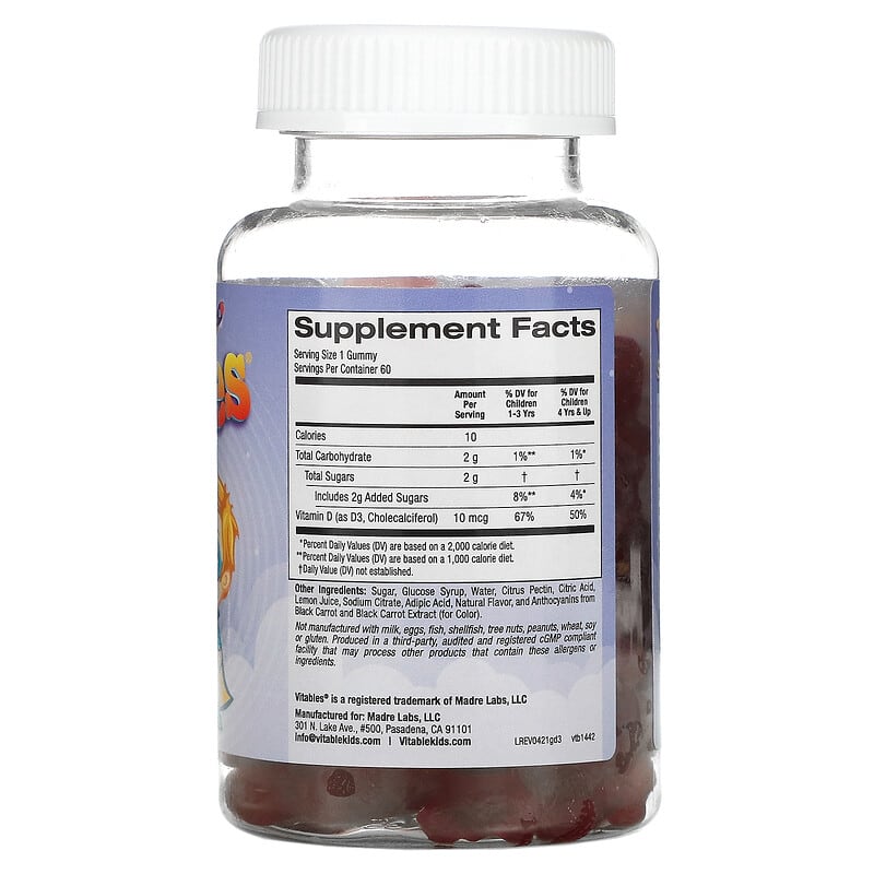 Vitables Gummy Vitamin D3 For ChildrenSuper Gummies for Superheroes!Featuring Vitamin D3 (Cholecalciferol)Promotes Strong Bones and Immune Health*Strawberry Flavor60 Vegetarian GummiesGelatin Free, Made with Citrus PectinNo Gluten, No High Fructose Corn Syrup, and No Artificial Colors or SweetenerscGMP Manufactured and Quality Confirmed